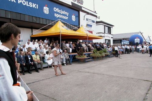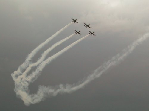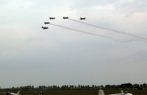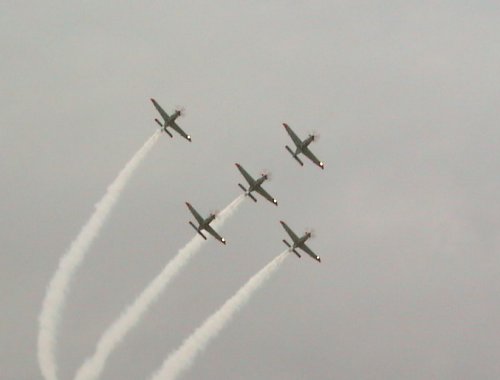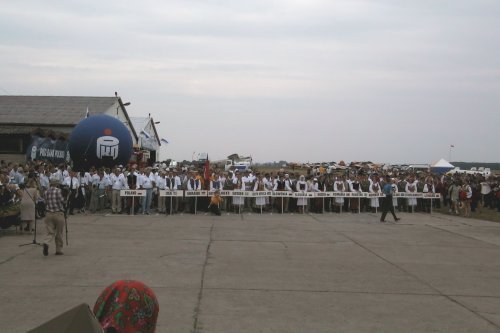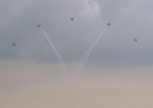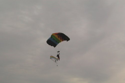 The parade and speeches were followed by an airshow. About 40 parachutists floated down over the field. Each with a team's flag attached. The jumper with our flag also had a red and white canopy. It was a wonderful sight.