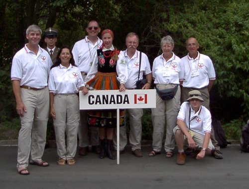 From left to right, first row, Dale Kramer "D2"- Pilot, Carmen Waters - Team Captain, Young Polish lady who carried the Canada sign in the parade, Ed Hollestelle "A1" - Pilot, Annemarie Hollestelle - Crew and past Manager of Canadian Team, Michal Walkowiak (kneeling) - Crew. Second row, Polish soldier who escorted our team in the parade, George Szukala - Crew, Art Grant - Glider weighing and configuration.